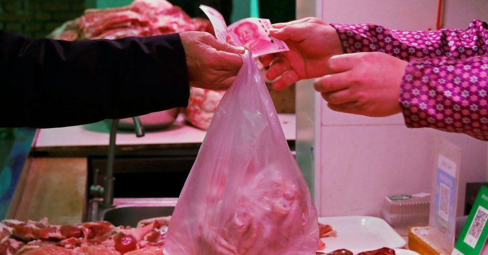 A man pays for meat at a market in Beijing, China January 11, 2021. REUTERS/Tingshu Wang