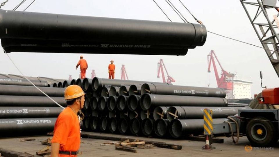 REFILE – CORRECTING PIPE MATERIAL Workers direct a crane lifting ductile iron pipes for export at a port in Lianyungang, Jiangsu province, China June 30, 2019. REUTERS/Stringer ATTENTION EDITORS – THIS IMAGE WAS PROVIDED BY A THIRD PARTY. CHINA OUT.