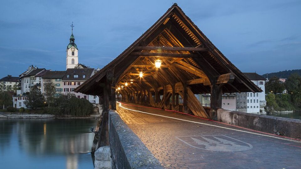 Covered bridge over Aare river in Olten at dawn. (Photo by: Loop Images/Universal Images Group via Getty Images)