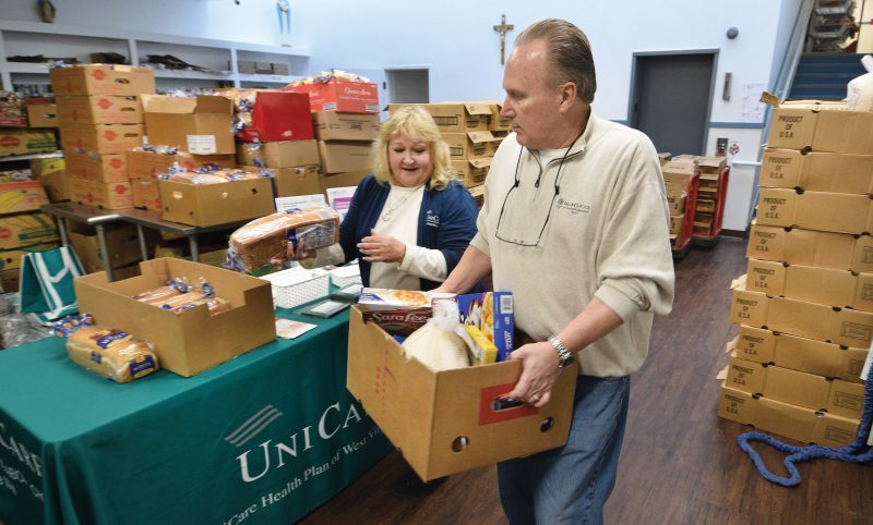 Volunteers Quenton Northcraft, foreground, and Darlene Stuckey, assist area families with food baskets during Catholic Charities Neighborhood Center annual Christmas Gift Distribution event Monday.