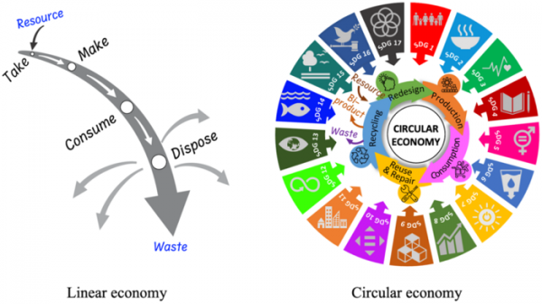 In order to meet sustainable development goals, circular economy (with a “made-to-be-made-again” policy) represents a fundamental alternative to the linear economic model (with a “take-make-consume-dispose” policy) that is restorative to maintain the utility of products, components, and materials, and to retain their values. The main challenge is to minimize the need for new inputs of material and energy while reducing the environmental pressure linked to resource extraction, emissions, and waste. The circular economy model offers a new chance for innovation and integration among natural ecosystems, businesses model, public-private-partnership, our daily lives, society, and waste management. The image above shows a comparison between linear and circular economy models. As the name suggests, the resource goes through a take-make-consume-dispose sequence linearly to finally produce a larger amount of waste material in a linear economy. On the other hand, in circular economy, the resource cycles through the production loop with lesser waste as well as some useful biproducts, which is well in tune with the aspirations of many SDGs.