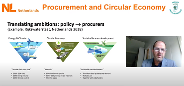 Next up was Cuno Van Geet, Strategic Advisor Circular Procurement at Rijkswaterstaat in the Netherlands. Rijkswaterstaat is the executive agency of the Ministry of Infrastructure and Water Management, dedicated to promoting safety, mobility, and quality of life in The Netherlands. Van Geet explained how Rijkswaterstaat started circular procurement using a bottom-up approach, first through action, learning through the process and formulating a policy through the experience. This showed that the process is not always linear, and that practice-based learning is important to be able to develop effective circular procurement strategies.