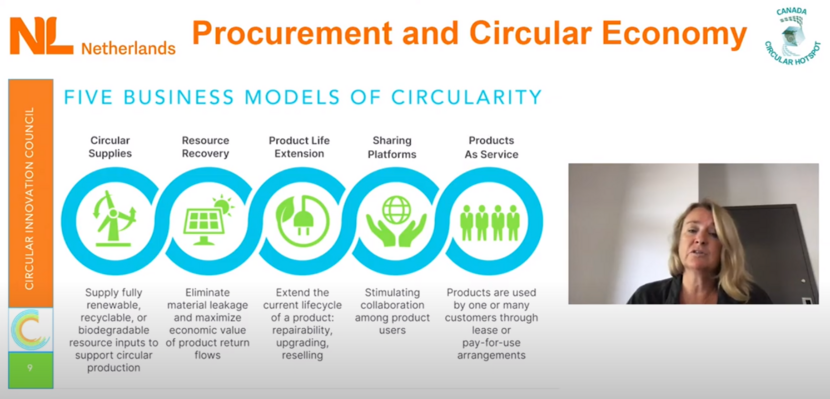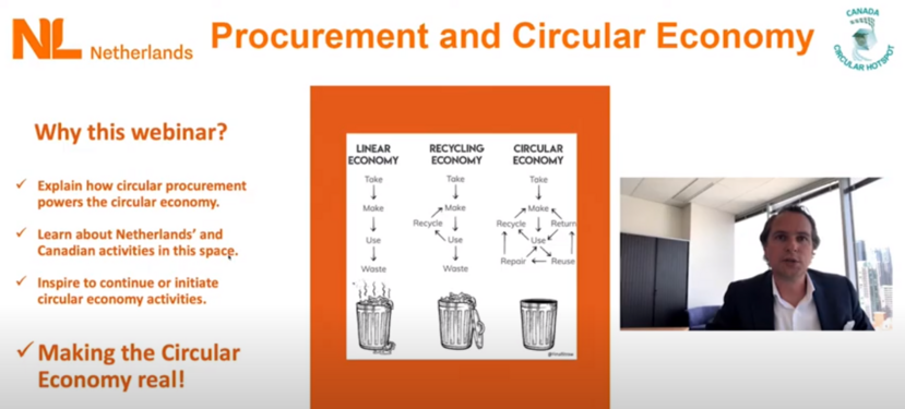 The webinar “Procurement and Circular Economy” is part of the series “Making the Circular Economy Real”, organized by the Consulate General of the Kingdom of the Netherlands in Toronto and Canada Circular Hotspot. Key objectives of the webinar series are increasing participant’s knowledge, expanding networks, showing the circular economy in real world action and inspiring the development of new circular economy projects in Ontario and across Canada.