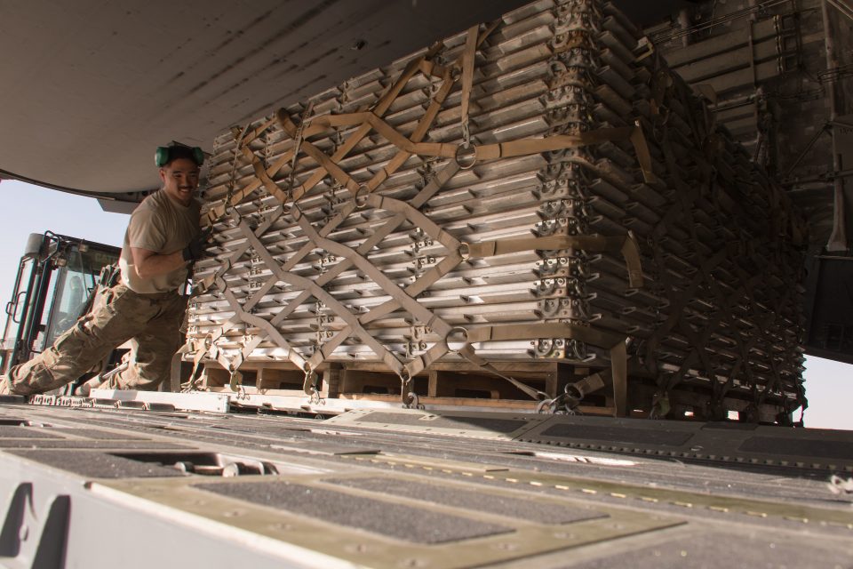 Photo Courtesy: DVIDS/Staff Sgt. Andrew Park 94th Airlift Wing – An 870th Air Expeditionary Squadron aerial porter pushes a pallet into the cargo area of a C-17 Globemaster III at Al Asad Air Base, Iraq, Jan. 9, 2017.