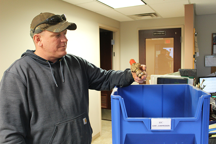 Alpena Department of Public Works employee Greg Nowak shows off a small piece of the inventory of non-lead fittings which can be used to replace any lead fitting in the water system. There is also an inventory of larger pipes that can be used to replace lead service lines when needed. The state has required municipalities to remove all lead from their systems by 2040 without offering any funding to help cover the cost.