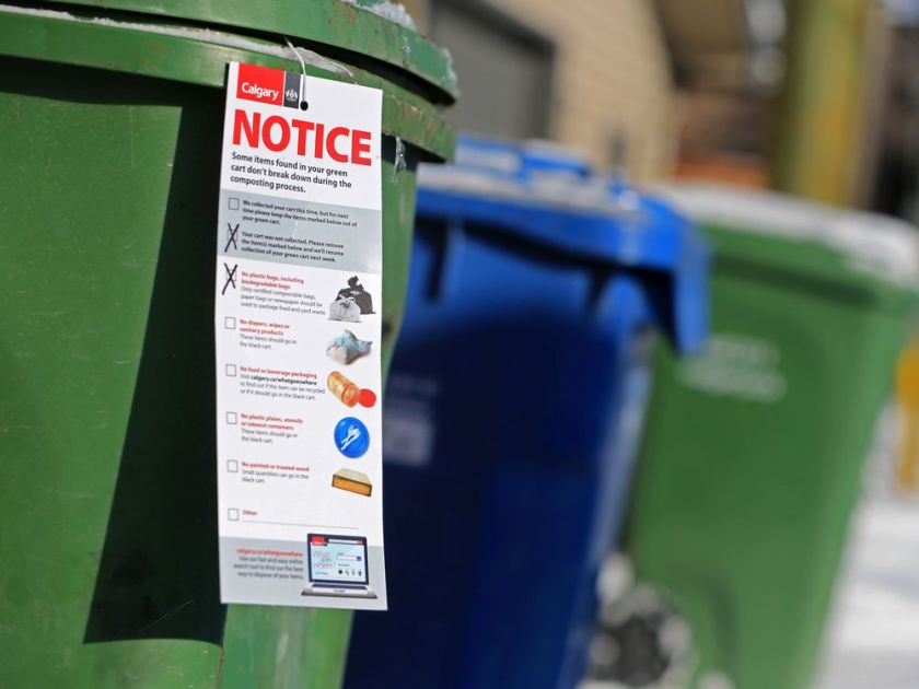 A green cart notice showing what cannot go into Calgary’s composting bins was photographed on Wednesday February 13, 2019.