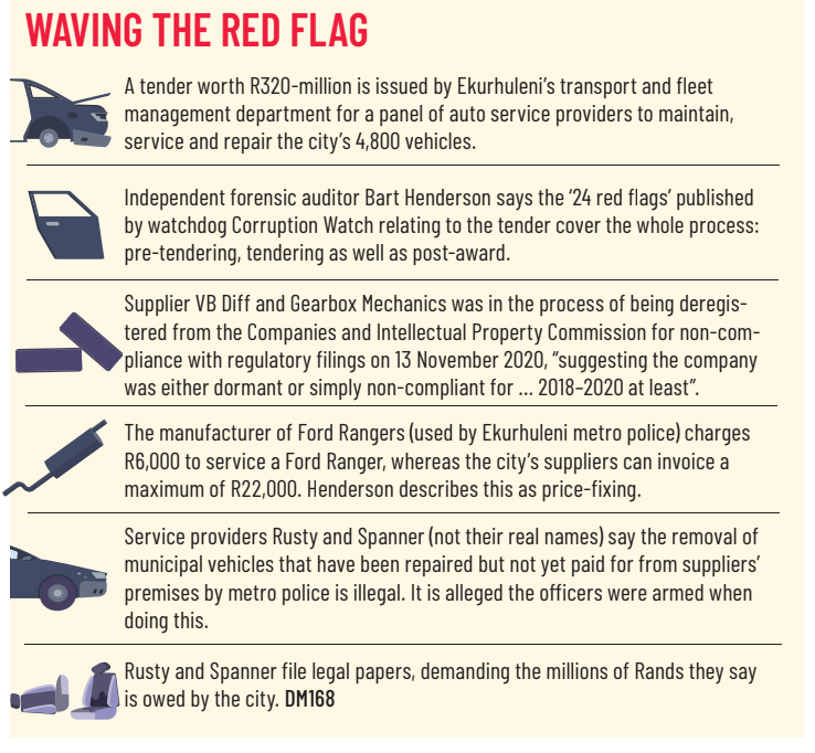 Tender AFM/05/2020, worth R320-million, was issued by Ekurhuleni’s transport and fleet management department for a panel of motor service providers to maintain, service and repair the city’s 4,800 vehicles. It started out as AFM/03/2020 and fell outside the Auditor-General clean audit period.