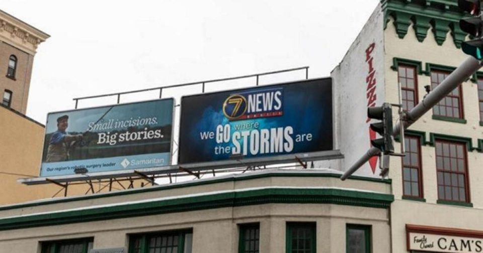 The current billboard sits in an empty grass field adjacent to the city’s Factory Square Park along the Black River.