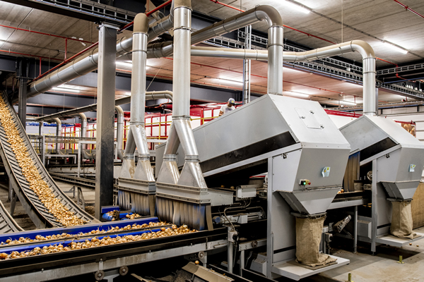 Modesta ended up providing a solution at almost every point in the production process: from receiving to packaging. The result is a total of 180 000 m3/h (105 943 cfm) of air technology. A windsifting cleaning system has been installed at the inlet of the pre-sorters. At the electronic sorter, a combination of dust extraction and an overpressure system ensures that the product and the cameras remain clean. Sjoerd explains: “Blower beams blow off and filter out all the loose leaves from the onion. In addition, the overpressure system ensures that dust stays outside so that the camera technology is not affected by dust.” The residual dirt from the onion toppers ends up in closed scraper conveyors totaling a length of no less than 160 meters (525 feet), which carry it to one of the two stationary compactors. This closed method prevents the dust and dirt from spreading throughout the factory.