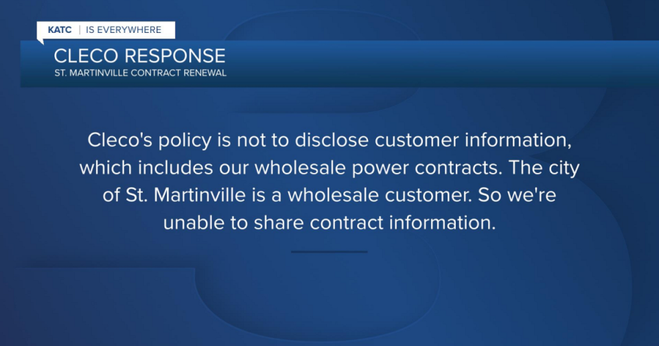 “Cleco’s policy is not to disclose customer information, which includes our wholesale power contracts. The city of St. Martinville is a wholesale customer, so we’re unable to share contract information.”