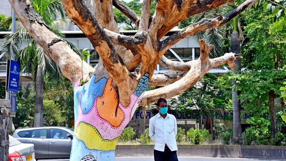 A man protects himself from Sun due to high temperature under a dead tree at Kharghar in Navi Mumbai.