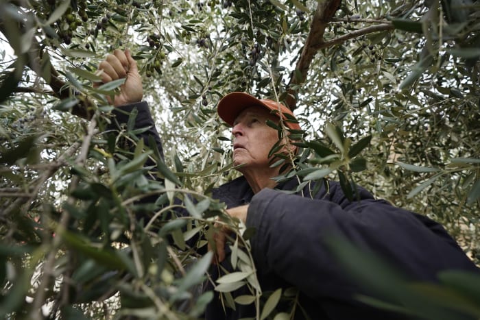 He zips around the property on his ATV studying the trees and flowers, determined to learn their names, and in the fall he hosts friends to help harvest olives, which he has pressed into oil.