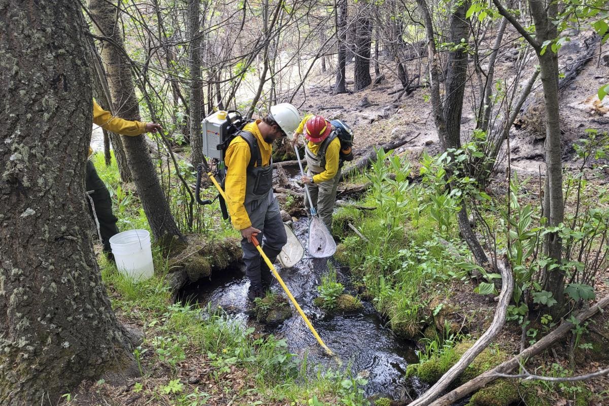 In this photo provided by New Mexico Department of Game Fish, biologists use dip nets to remove Rio Grande Cutthroat Trout from Rito Morphy stream near Mora, N.M., June 1, 2022. (Courtesy of NMDGF)
