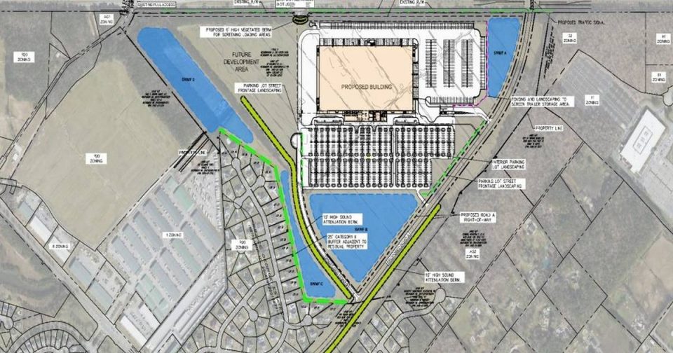 Even some of the renderings of the proposed facility contain the horizontal blue stripe present on other Amazon fulfilment centers.