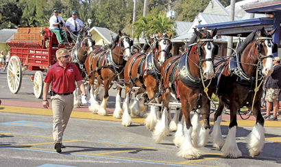 The Budweiser Clydesdales take their laps around the center parking lot during their visit to the Shell Factory last Tuesday.