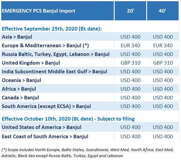 CMA CGM will therefore revise the current Emergency Port Congestion Surcharge [PCS] for cargo bound to Banjul until further notice as follows: