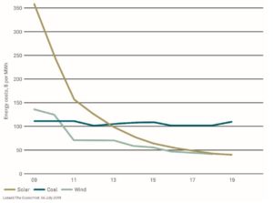 About five million jobs are already associated with the solar and wind industries and the falling cost of new wind and solar projects over the last decade has also made capital investment far more productive – all of which is further bad news for coal and other fossil-fuel producers.