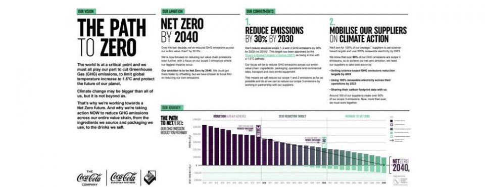 Coca-Cola European Partners (CCEP) is set to accelerate the decarbonisation of its business by reducing absolute greenhouse gas (GHG) emissions across its entire value chain – including scope 1, 2 and 3 emissions – by 30 per cent by 2030 (vs 2019)** and setting a path to become a Net Zero business by 2040, in alignment with a 1.5˚C pathway and the Paris Climate Agreement.