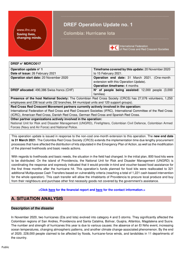 This operation update is issued in response to the non-cost one-month extension to this operation. The new end date is 31 March 2021. The Colombia Red Cross Society (CRCS) extends the implementation time due lengthy procurement processes that have affected the distribution of kits stipulated in the Emergency Plan of Action, as well as the modification of the planned livelihoods and basic needs actions.