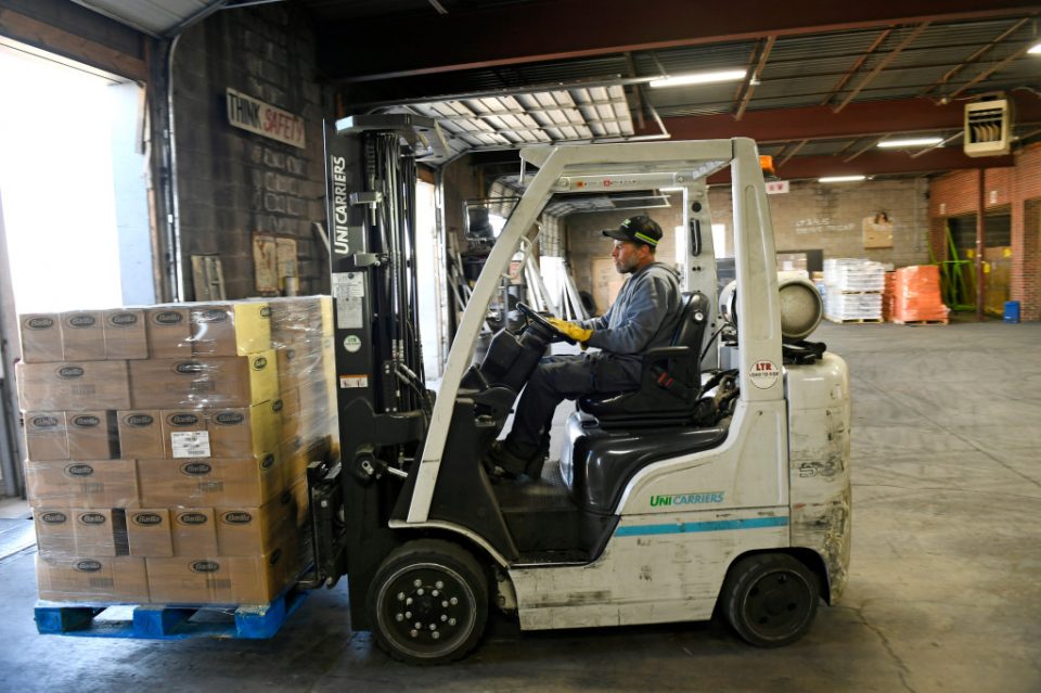 Forklift Operator Josh Howard, right, helps guide a truck into position to unload it at the docking area at Load To Ride in Denver on March 18, 2020.