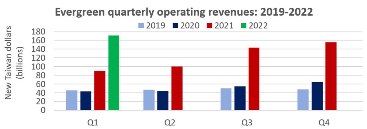 Taiwan’s Evergreen disclosed monthly operating revenues through the end of March. Its Q1 2022 operating revenue reached an all-time high 170.8 billion New Taiwan dollars, up 90% year on year and up 10% from the previous high in the fourth quarter.