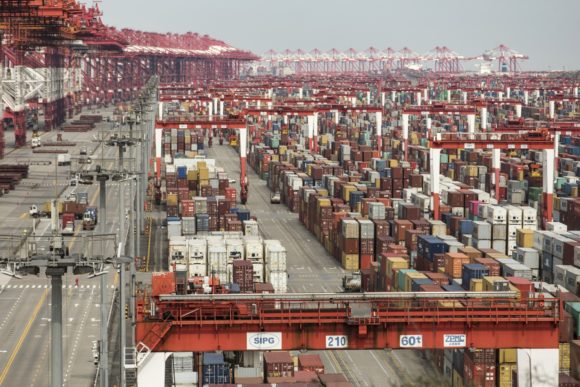 Photograph: Shipping containers stacked at the Yangshan Deepwater Port in Shanghai on March 23, 2020. Photo credit: Qilai Shen, Bloomberg.
