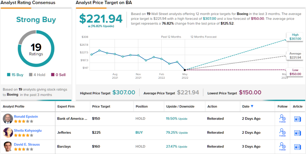 Overall, barring 4 skeptics, all 15 other recent analyst reviews on BA are positive and coalescing to a Strong Buy consensus rating. The average price target is slightly below von Rumohr’s; at $221.94, the figure suggests shares will climb ~77% higher in the year ahead. (See Boeing stock forecast on TipRanks)