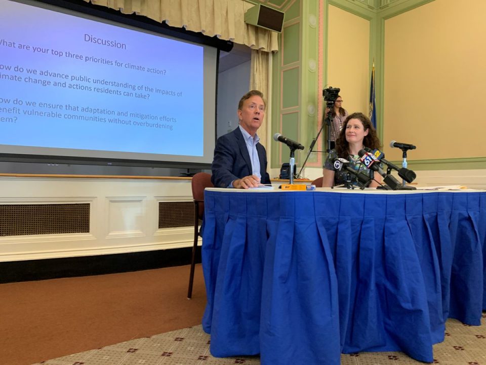 Gov. Ned Lamont and DEEP Commissioner Katie Dykes unveiled the governor’s environmental priorities for 2021. They are shown here earlier during a forum on climate change at the Connecticut Department of Energy and Environmental Protection headquarters in Hartford. (Slade Rand)