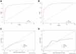 Figure 3 The evaluation of the nomogram to predict BCBM. The ROC curve in the training cohort (A) and the validation cohort (B). The C-index is represented by the area under the curve. The calibration curve in the training cohort (C) and the validation cohort (D). The C-index is represented by the area under the curve. The closer the curve is to the dashed line with a slope of 45°, the higher the calibration of the nomogram.
