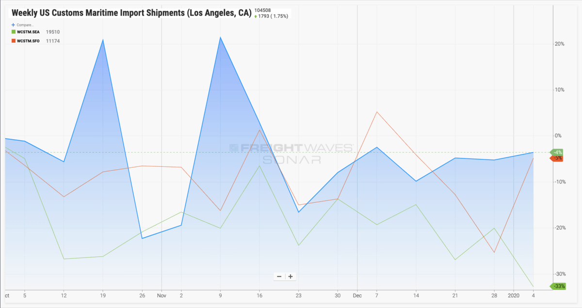 The early read on West Coast port activity shows a slow start to 2020. Weekly maritime import shipments to Los Angeles are down 4% from the start of October. (SONAR: WCSTM.LAX). Oakland and Seattle imports are down 5% and 33%, respectively. (SONAR: WCSTM.SFO, SEA)