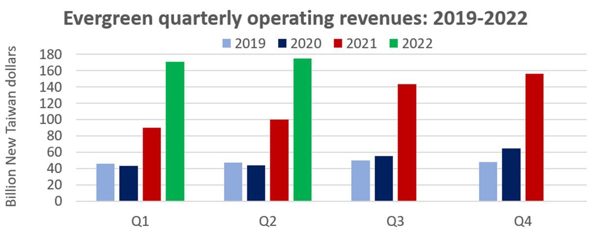 Evergreen, the world’s sixth largest carrier, also just posted its June operating revenues; Q2 2022 came in at a new all-time high of 175 billion New Taiwan dollars ($5.9 billion).