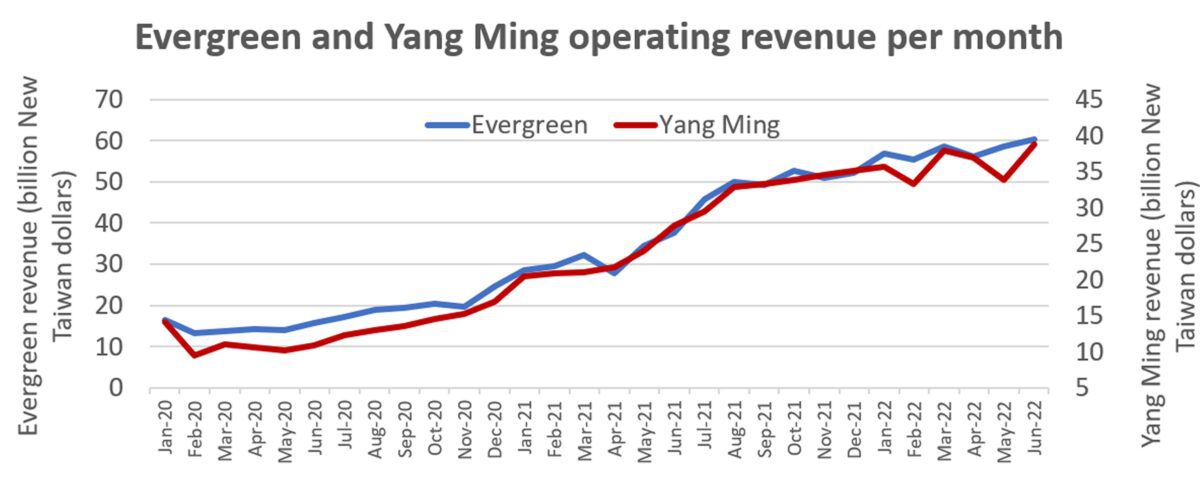 The same pattern — higher revenues despite lower spot rates — shows through in monthly operating data from Taiwan’s Evergreen and Yang Ming.