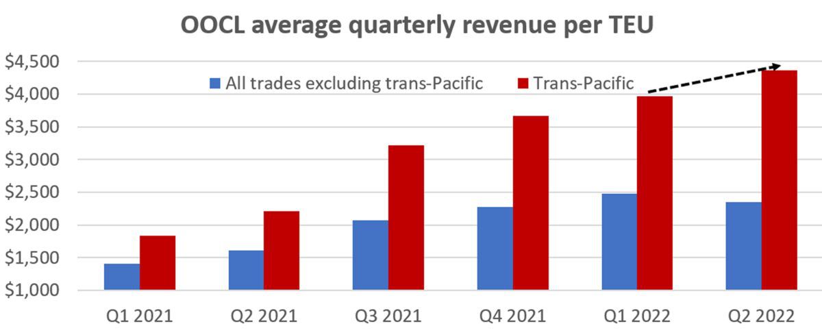 OOCL’s average worldwide revenue per TEU jumped 61.5% y/y to $2,874 in Q2 2022. The trans-Pacific market was by far the biggest driver. Revenue per TEU in the trans-Pacific spiked 97.6% y/y to $4,365. OOCL’s cargo in other trades (Asia-Europe, trans-Atlantic, intra-Asia) averaged only $2,355 in revenue per TEU, 46% below the trans-Pacific average.