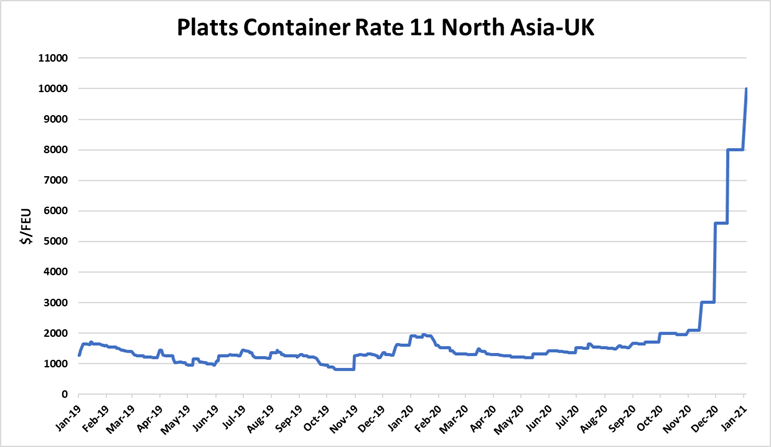 Platts Container Rate 11 — North Asia-to-UK — hit $10,000/FEU, an increase of 285% from Nov. 30, and these strong rates are expected to continue through towards the end of the quarter.