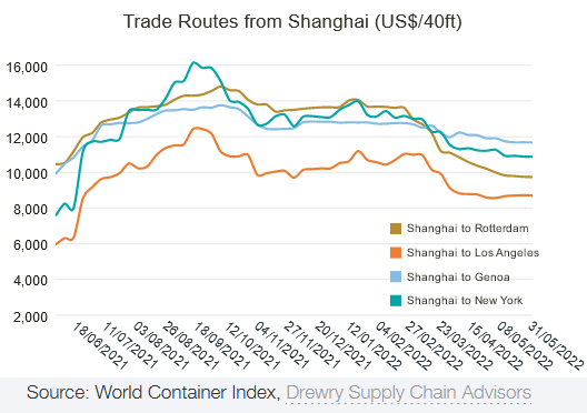 From Shanghai to New York, container freight rates dropped by 33% from $16,138 at the peak last September to $10,871 as of June 2 (chart via Drewry Supply Chain Advisors):