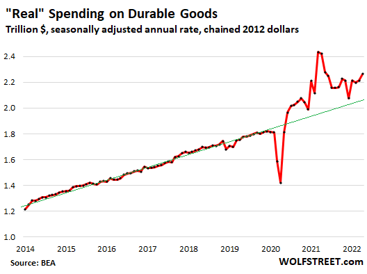 Since the peak in March and April 2021, real spending (adjusted for inflation) on durable goods has dropped by 6.5% but it remains at nosebleed levels.
