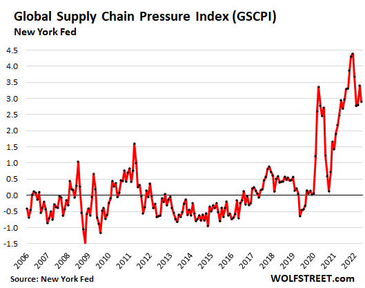 The decline in waiting times for container ships at Shanghai, and the decline in container freight rates show that the transportation chaos is getting partially resolved. But the wait times at Shanghai are still longer than they were; and container freight rates are still multiples higher than they were, and nothing has normalized yet.