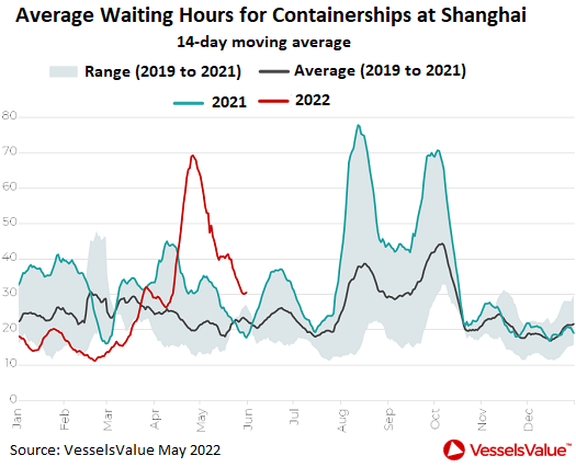 Average waiting times for container ships at Shanghai, after having spiked to nearly 70 hours in April (14-day moving average), amid the lockdowns that snarled port operations in Shanghai, have now declined to 31 hours, according to VesselsValue.