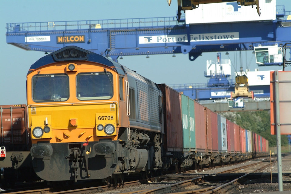 Felixstowe is a major world container port, and therefore must be aware of world events. Intermodal movements from the port are vital to the UK economy (Network Rail image)