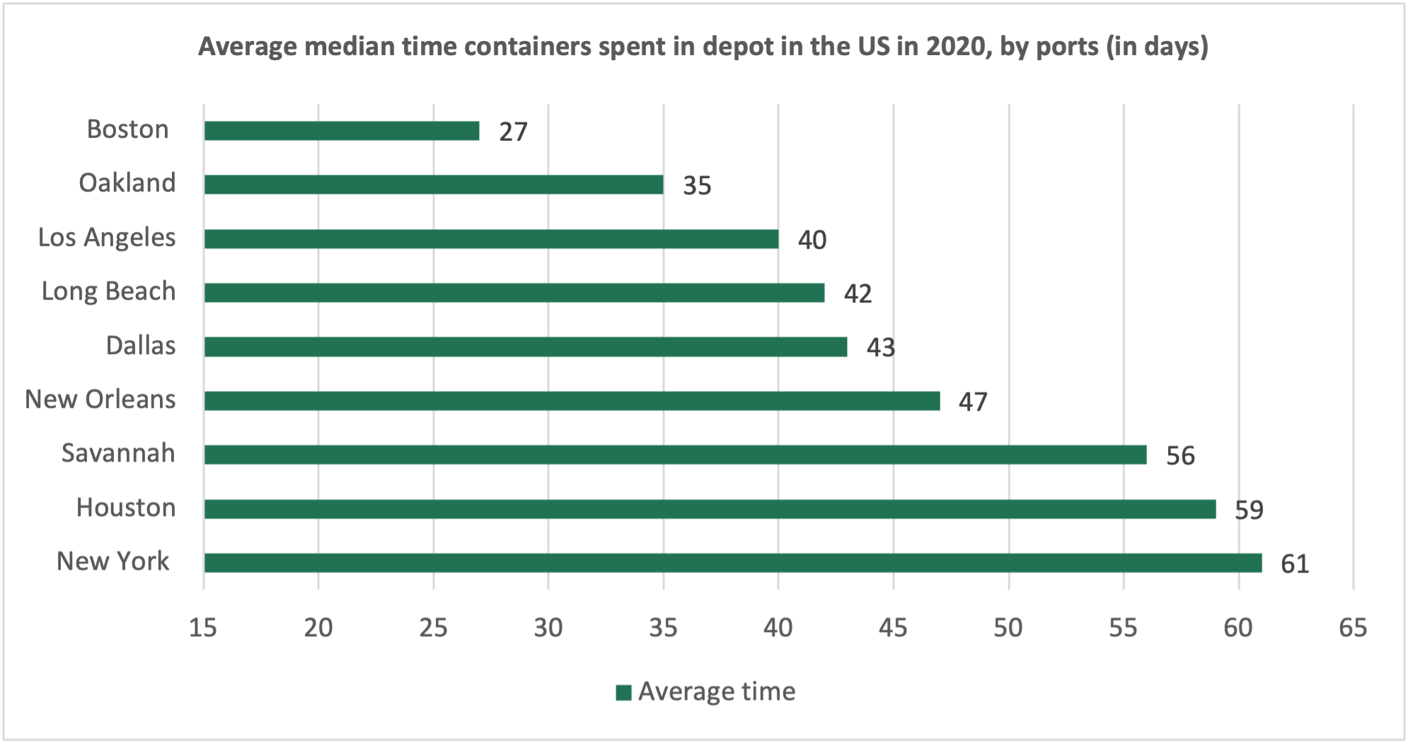 The study found that in the US, the second-worst performer in terms of the average median time containers spent in depots in 2021, performance varied hugely by port. Across the country, average dwell times were 50 days last year(2021), down from 66 days in 2020. New York recorded 61 days of container idle time at depots followed by Houston (59 days) and Savannah (56 days). The ports of LA and LB, on average recorded 40 to 42 days of container idle time.