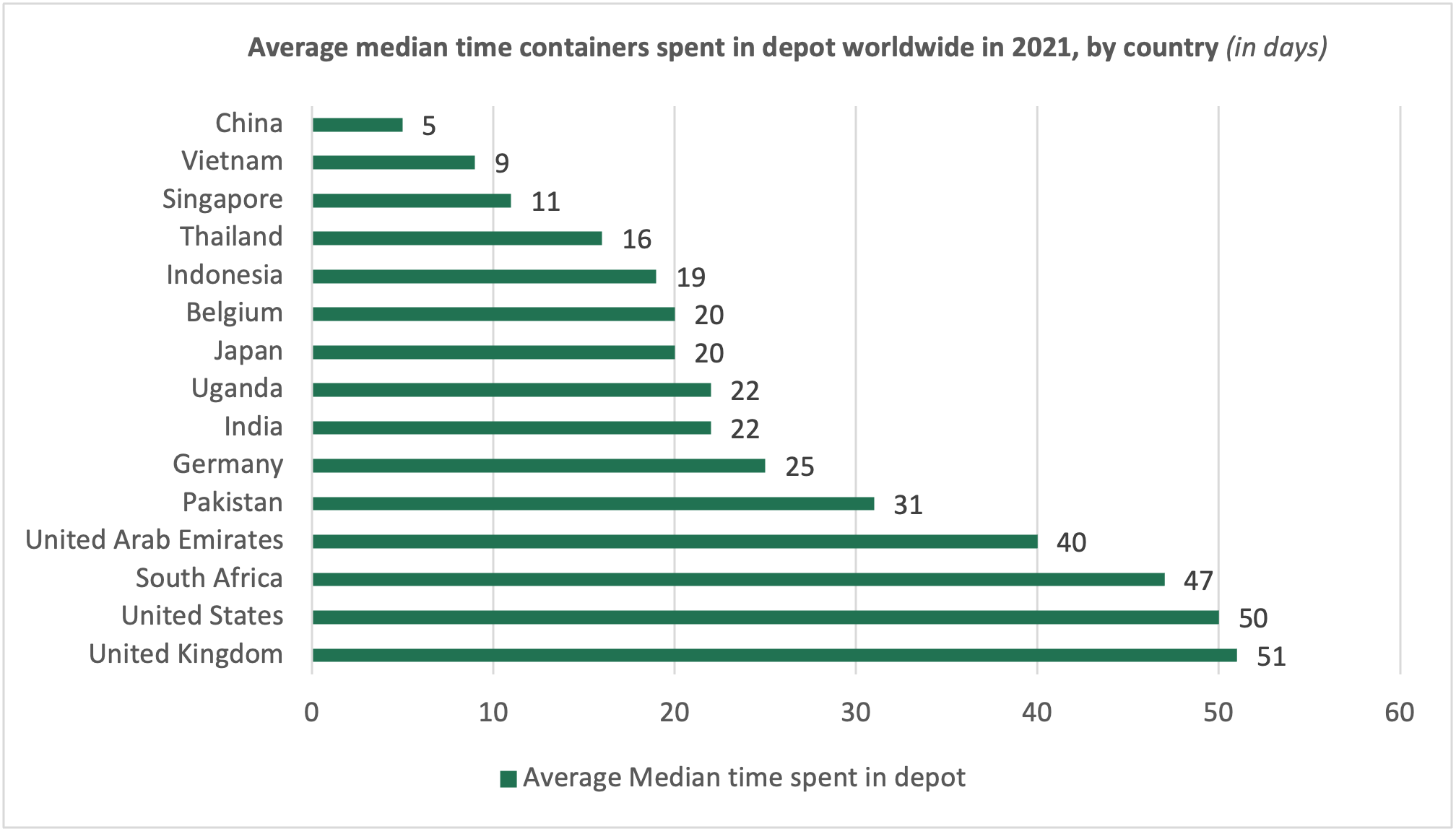 The worst performing countries in terms of the average median time containers spent in depots in 2021 were the U.S. and the UK which suffered average dwell times of 50 and 51 days, respectively. The next worst performers were South Africa (47 days), United Arab Emirates (40 days), Pakistan (31 days) and Germany (25 days).