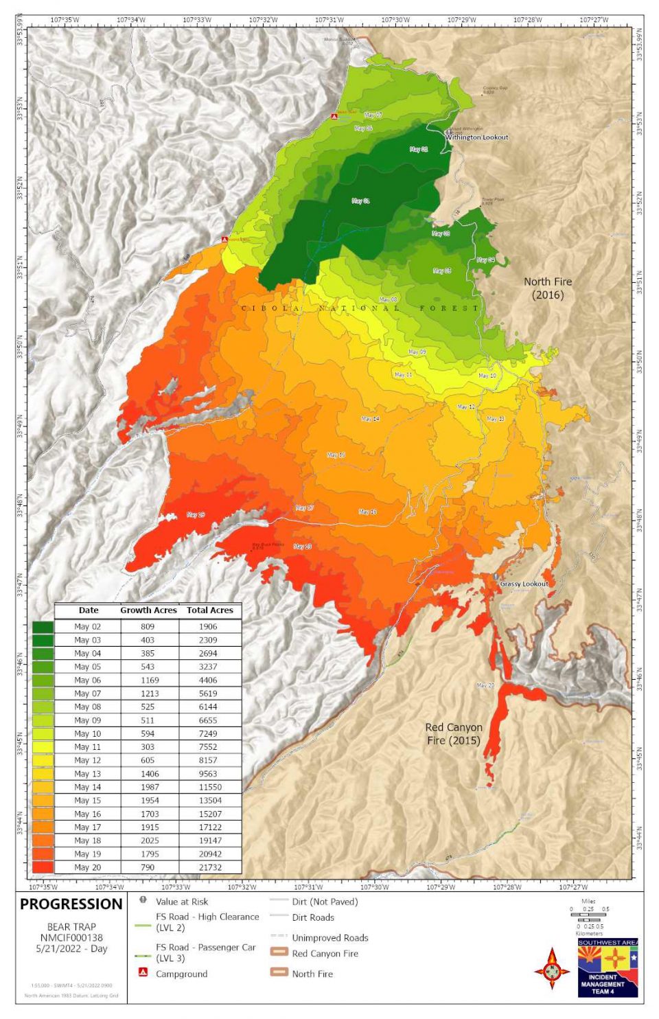 Smoke: Smoke from the Bear Trap Fire and other nearby fires may be visible in the areas of Alamo, Datil, Magdalena, Socorro, Winston, and San Antonio, NM. Smoke-sensitive individuals and people with respiratory problems or heart disease are encouraged to take precautionary measures. Information on air quality and protecting your health can be found at the New Mexico Department of Health Environmental Public Health Tracking website: nmtracking.org. An interactive smoke map at https://fire.airnow.gov/ allows you to zoom into your area to see the latest smoke conditions.