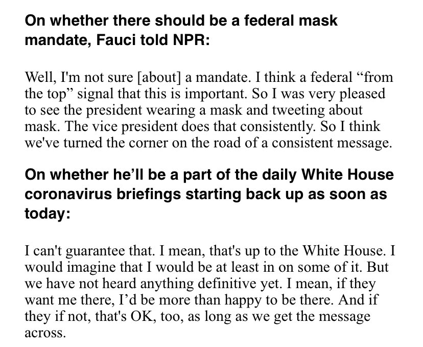 • Mr. Trump is set to resume his live virus briefings starting at 5 p.m. Tuesday, attributing his decision not to the increasing threat of the pandemic but to the fact that the briefings had high television ratings. The country’s top infectious disease doctor, Dr. Anthony S. Fauci, who has been sidelined by the president in recent months, told NPR he expects to be “at least in on some of it.”