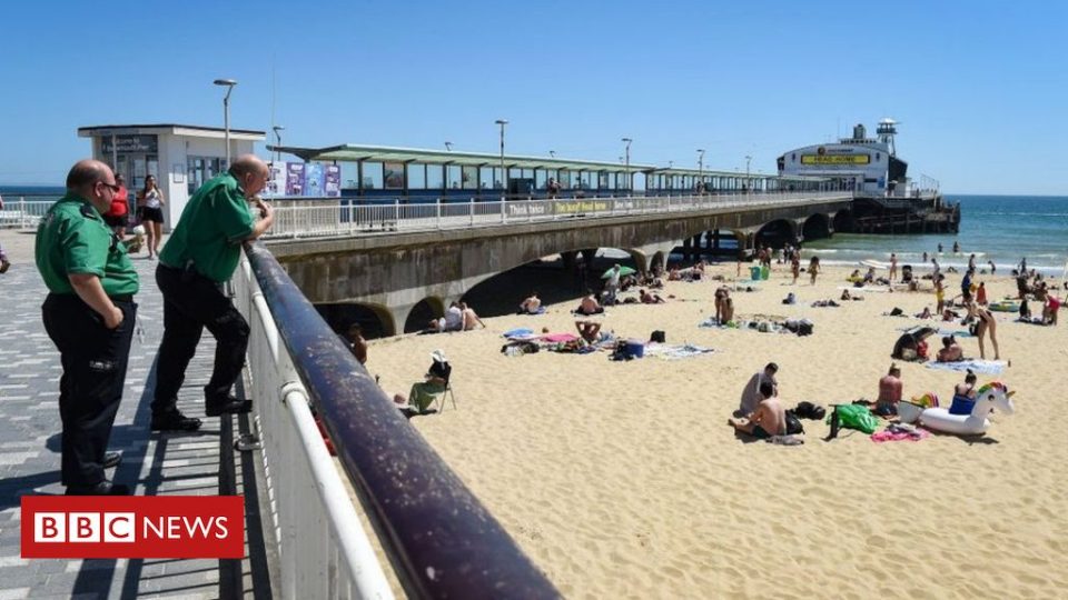 People sunbathing on the beach by Bournemouth pier as lockdown eases
