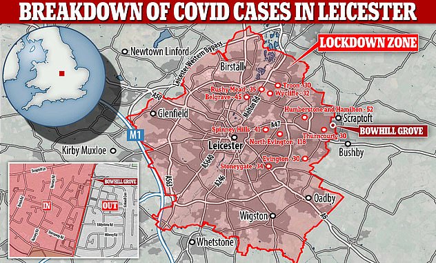 Pictured: The lockdown zone in Leicester, which has left some Britons in lockdown while their neighbours are not