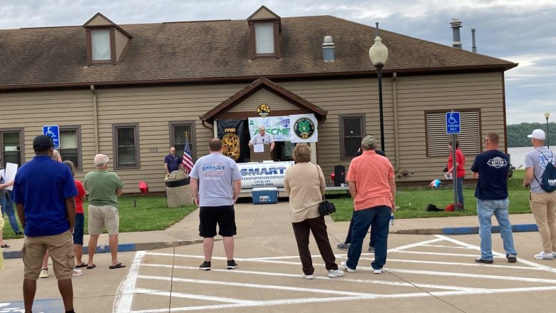 At the Sunday, May 15, rally in Fort Madison, Iowa, a group of around 40 railroad workers, their families, and representatives from organized labor in Southeast Iowa gathered outside the riverfront pavilion in front of the Amtrak station to voice their condemnation of the Hi-Viz policy and the untenable situation the rail companies have put workers in.