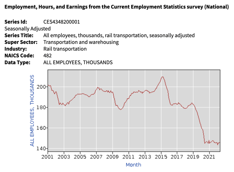 Hi-Viz is not an aberration; it is merely the latest egregious manifestation of a cost-and-corner-cutting philosophy that has predominated in the rail industry for years, resulting in trains getting longer and heavier and crews getting slimmer and buried under more work. Looking at the visualized employment data for rail transportation workers on the Bureau of Labor Statistics website, one can see how dramatically rail companies have reduced their workforce since 2015: