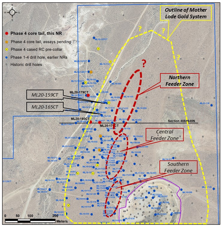 The newly defined large, higher-grade feeder system at Mother Lode occurs as a series of echelon zones along a north-northeast trend that likely has a corresponding deep-seated intrusive connection. We see these broad zones of higher-grade material directly related to intrusive dikes and continues to confirm the genetic relationship of the gold deposit to a high-level magmatic system at depth (shallow porphyry environment). The Northern Feeder Zone remains open to the north-northeast and at depth, with grades generally improving in both of these directions.