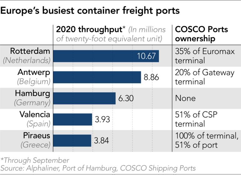 “The key issue is that COSCO has a large shipping fleet which can channel everything to its own port,” said Frans-Paul van der Putten, a senior research fellow at Clingendael Institute for International Relations in the Netherlands. “This results in a market dominance that ultimately changes the way goods are transported into Europe’s economic center.”
