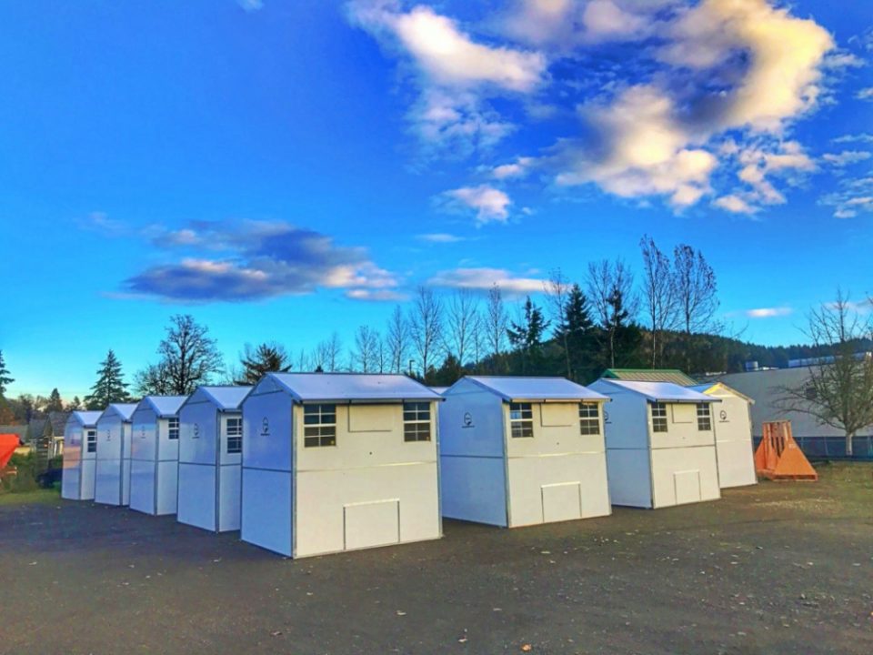 The shelters are manufactured by the Washington-based company Pallet, which defines itself as a “social purpose company” aiming to end unsheltered homelessness and develop a nontraditional workforce.